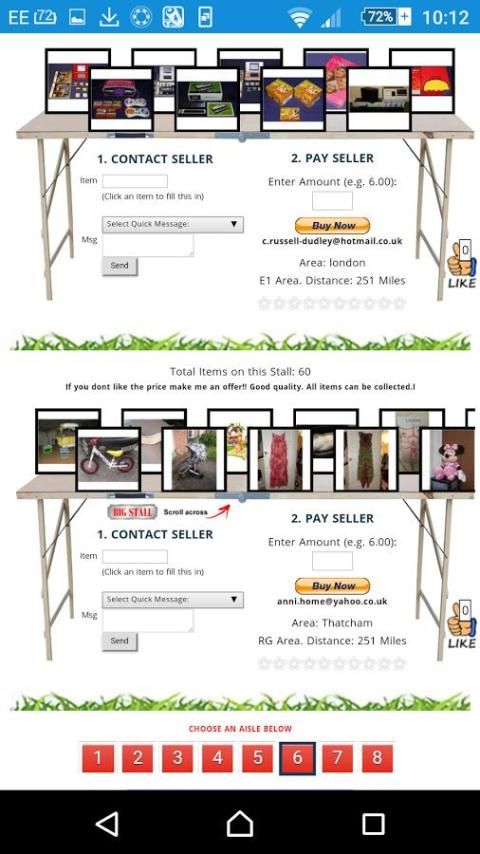 Layout ini menarik lebih menarik sebagai pembeli dapat menggeledah sekitar, menemukan harta karun dan kemudian hanya penjual pesan untuk membahas penjualan. Kotak kontak dan lokasi penjual di bawah masing-masing kios. Dengan fitur Pesan Cepat kami, pembeli dapat dengan cepat meminta hal-hal seperti: