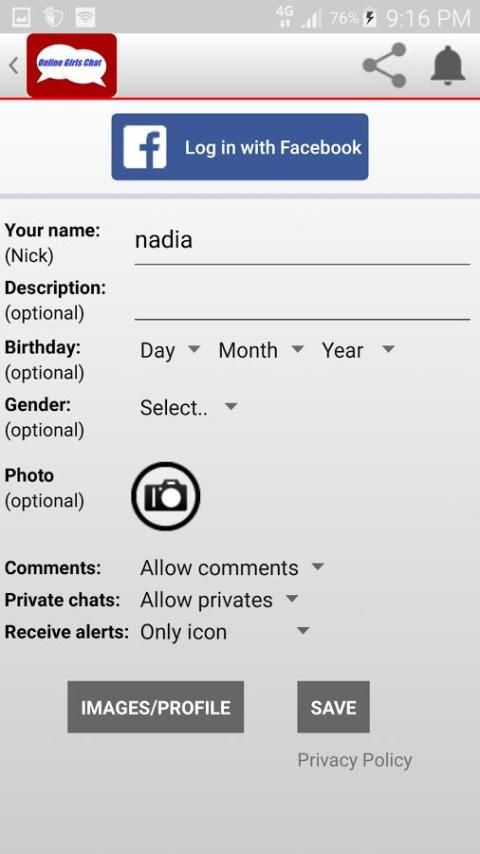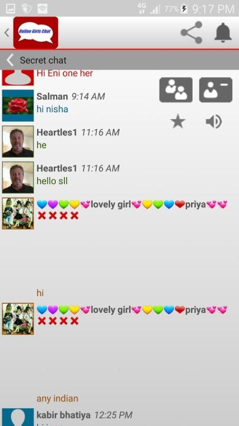 Selamat Datang gadis secara online chat.This aplikasi chat adalah 100% aplikasi online gratis Dalam aplikasi ini Anda dapat chatting dengan gadis-gadis dan anak laki-laki dan perempuan dari seluruh dunia dan Anda dapat chatting dengan teman-teman dan Anda dapat mengirim gambar Anda ke teman Anda dan Anda bisa chatting dengan teman-teman di pribadi dengan privasi 100% dan Anda juga bisa chatting dengan teman-teman 100% gratis dengan registrasi.