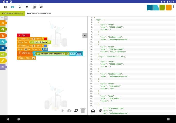 Code and Play - di Open Roberta® Lab Anda membawa robot dan mikrokontroler Anda untuk hidup dengan bahasa pemrograman grafis NEPO®. Dengan drag dan drop Anda membuat program untuk sistem yang berbeda dengan cepat dan main-main. Dengan menggunakan aplikasi »Buka Roberta mobile«, Anda dapat secara nirkabel mengirimkan program NEPO untuk LEGO Education WeDo 2.0 via Bluetooth - baik di smartphone atau tablet.