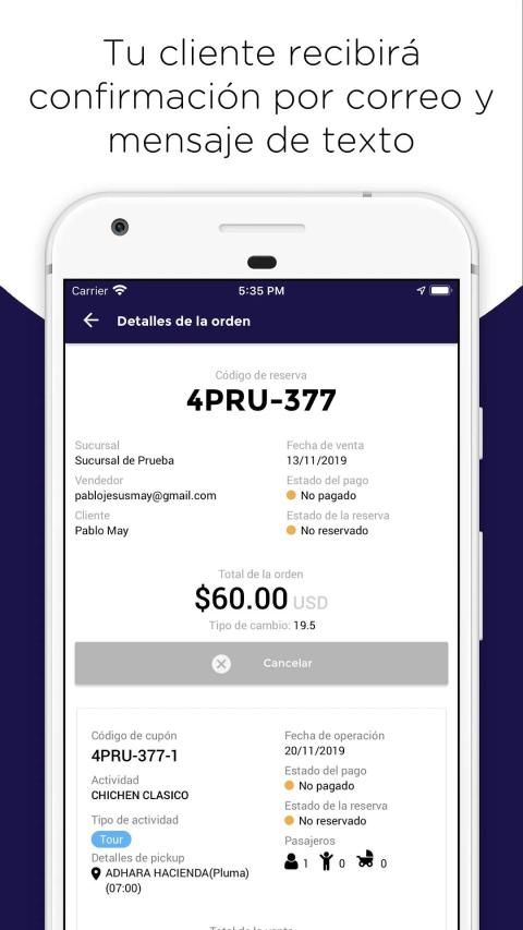 Tu cliente recibirá la confirmación de su reservación por correo electrónico y por mensaje de texto. Se le indicará la actividad a realizar, la cantidad de pasajeros, la fecha del tour y el código de confirmación del proveedor.