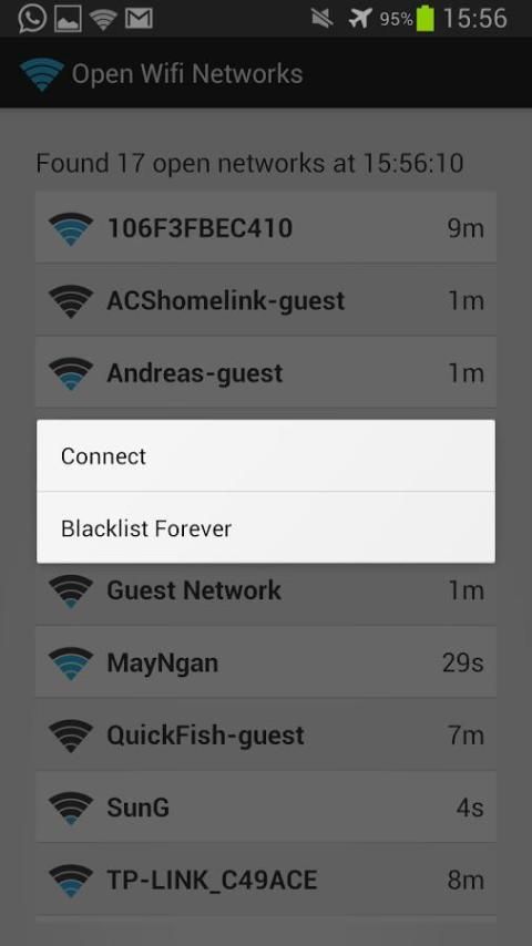 Memulai aplikasi. Ini akan mulai memindai jaringan wifi terbuka dan akan menampilkan mereka sebagai daftar. Untuk setiap jaringan yang ditampilkan dalam daftar, kekuatan, SSID dan terakhir kalinya jaringan disiarkan akan ditampilkan di setiap baris. Untuk bertindak atas jaringan tertentu, tekan lama jaringan untuk mendapatkan menu konteks dengan dua (2) pilihan: blacklist dan terhubung. Daftar hitam akan mencegah jaringan dari yang pernah muncul lagi. Hubungkan akan mencoba untuk menghubungkan perangkat Anda ke jaringan.