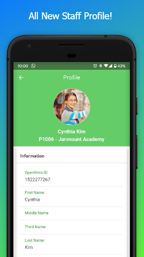 Aplikasi Ruang Staf Openemis adalah alat untuk mengelola data staf.Mereka dapat memperbarui profil pengguna seperti alamat, tanggal lahir, gambar profil dan informasi lainnya.