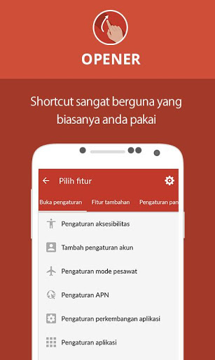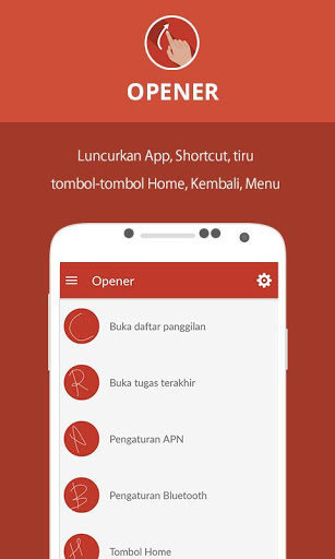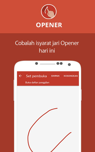 Opener merupakan aplikasi yang sederhana, cepat, dan dapat diandalkan. Dengan hanya suatu isyarat jari pada tampilan depan, aplikasi Opener memungkinkan anda untuk meluncur aplikasi terpasang tanpa melewati rute lama. Tidak hanya itu, anda bahkan tidak perlu meluncurkan shortcut. Opener membebaskan akses semua aplikasi terpasang, dan oleh karena itu, user bisa menyetel peluncuran aplikasi apa saja lewat isyarat pada tampilan utama.
