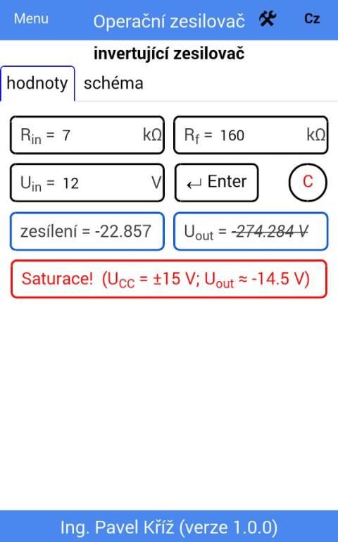 Setelah memasukkan nilai input dihitung gain tegangan dan tegangan output. Ini memperhitungkan munculnya kejenuhan. Setiap diagram berisi skema.