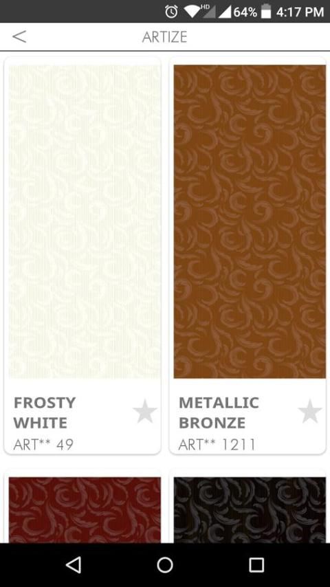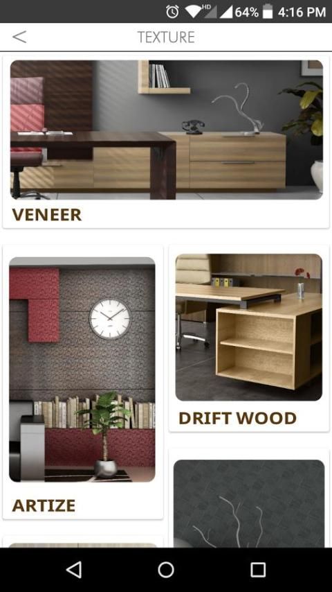 Aplikasi ini mencakup sejumlah besar laminasi yang dirancang dengan pola-pola alami, kontemporer, dan abstrak bersama dengan tekstur yang menambah dimensi lain untuk dekorasi interior. Pengguna dapat menelusuri melalui koleksi dan pilih preferensi mereka.