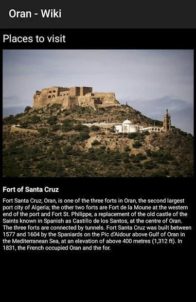 Oran – Wiki also gives out offline information about the Popular Attraction like Fort of Santa Cruz,Hassan Pasha Mosque,Abdallah Ibn Salam Mosque,Ahmed Zabana National Museum,Seafront Oran,Parc Attraction,Citadin Méditerranéen Garden,Foret de Canastel,Palace of the Bey,Museum Ahmed Zabana,KIDDY GARDEN,Small Zoo D Oran,PARK CITY SWEET GAMES.