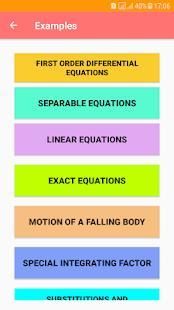 Ini aplikasi pertama saya untuk diploma thesis.The Tujuan dari aplikasi ini adalah untuk menyelidiki materi kursus digital aplikasi Android berkembang dengan perangkat lunak yang sesuai termasuk Catatan kuliah, Latihan, tes dan implementasi interaktif tentang Biasa Persamaan Diferensial saja. Sebuah android merupakan sumber sistem operasi mobile terbuka disumbangkan oleh Google. Ketika kita membangun aplikasi itu, kami menggunakan studio Android. Sebuah studio android adalah resmi pengembangan lingkungan terpadu (IDE) untuk Google Android. Ini tersedia untuk di-download pada Windows, Mac OS dan sistem operasi berbasis Linux. Secara umum, Google bermain adalah tempat yang paling aman untuk men-download aplikasi mobile untuk sistem Android. Catatan akan diambil dari buku-buku terkait tentang persamaan diferensial biasa. Aplikasi ini akan memiliki tombol adalah catatan, rumus, kuis, dan contoh-contoh diselesaikan sekitar urutan pertama persamaan diferensial biasa, agar persamaan diferensial biasa kedua dan beberapa persamaan khusus.