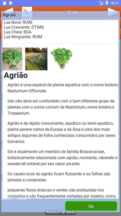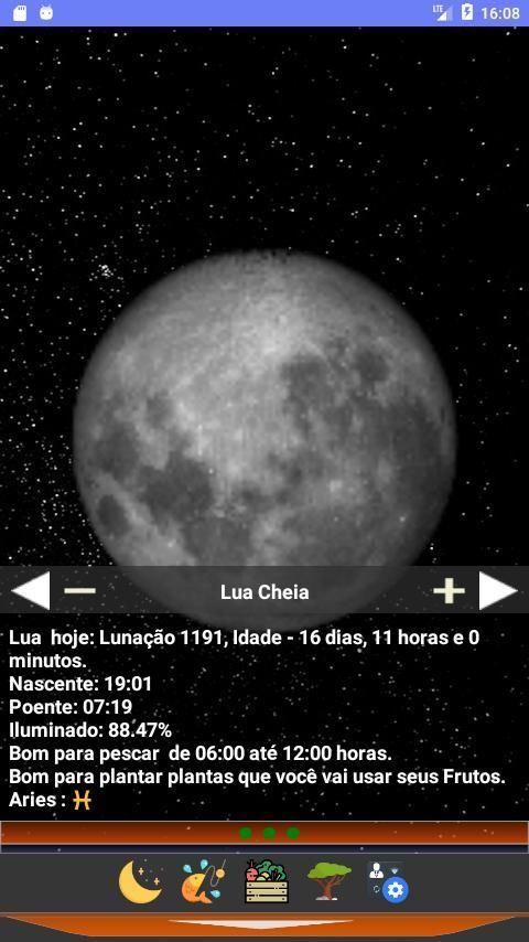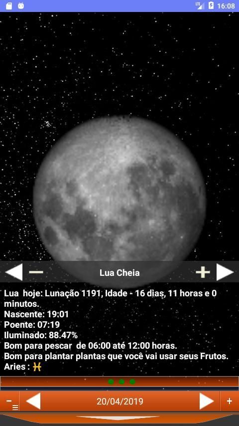 O calendário abre com a data de hoje, escolha um ano, um mês e escolha um dia no calendário, escolha entre ver detalhes da Lua, dicas de plantio de flores e hortaliças, e dicas de boa fase da Lua para pescaria.
