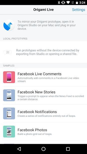 Origami Live is the companion app for Origami Studio for Mac, a free design tool for creating interactive UI prototypes. Create prototypes using Origami Studio for Mac, and connect an Android phone or tablet running Origami Live to use them on your device. Export prototypes to Origami Live to take them on the go. Open and share any file from Origami Studio sent over email.