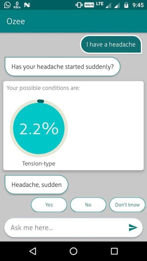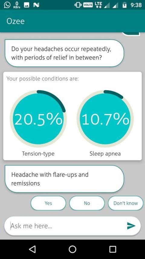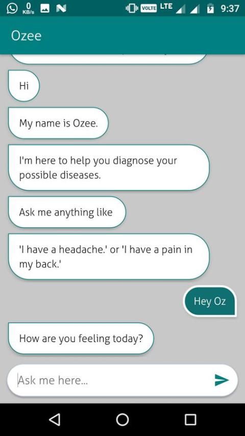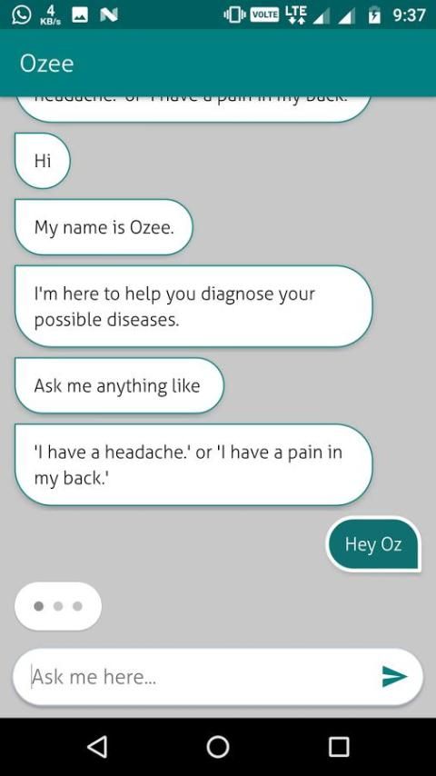 Ozee adalah interaktif, asisten AI bertenaga berdasarkan dialog-untuk mengetahui kondisi fisik dan mental Anda. Ozee ini didukung oleh wit.ai Alam Bahasa Landasan dan mendapat semua wawasan diagnostik yang dari Infermedica.
