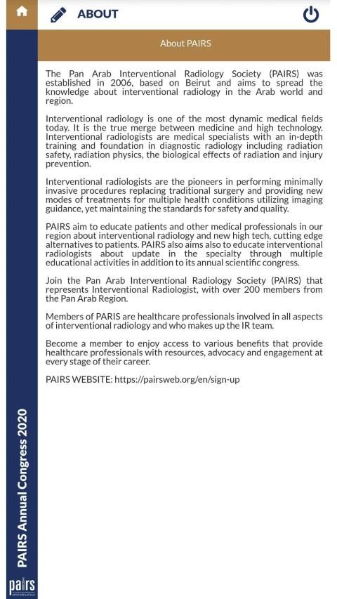 Aplikasi resmi Kongres Tahunan Masyarakat Radiologi Intervensi Pan Arab (PAIRS) yang akan diselenggarakan pada 26-29 Februari di Grand Hyatt Dubai, UAE.