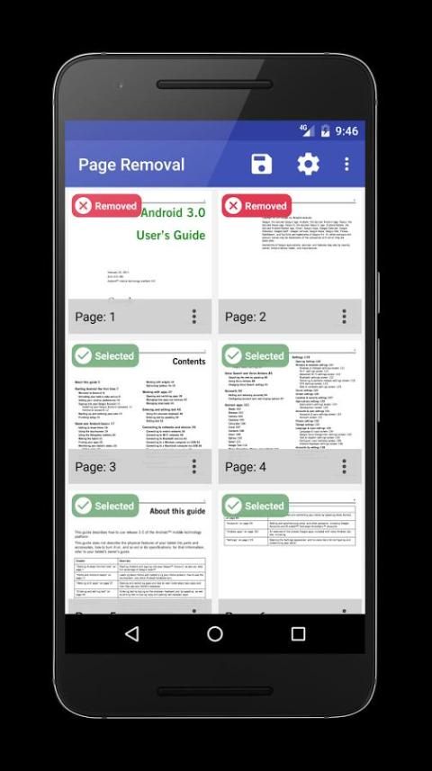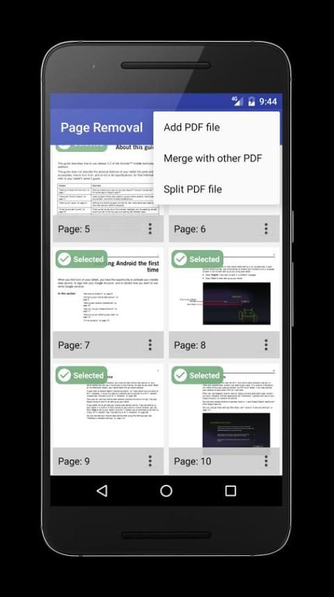Application used to remove PDF pages. To remove a page just long press on the selected item or click on more options icon attached to a page.