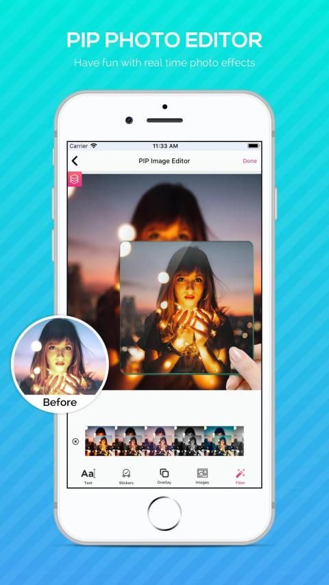 With lots of amazing features, Photo/Pics Editor includes tools to create cutouts, crop, stretch, clone, add text & adjust curves. It also has a full library of artistic photo filters (including HDR), frames, backgrounds, borders, callouts & more. In Pip collage maker, you can edit the picture with the PIP effect and shadow!