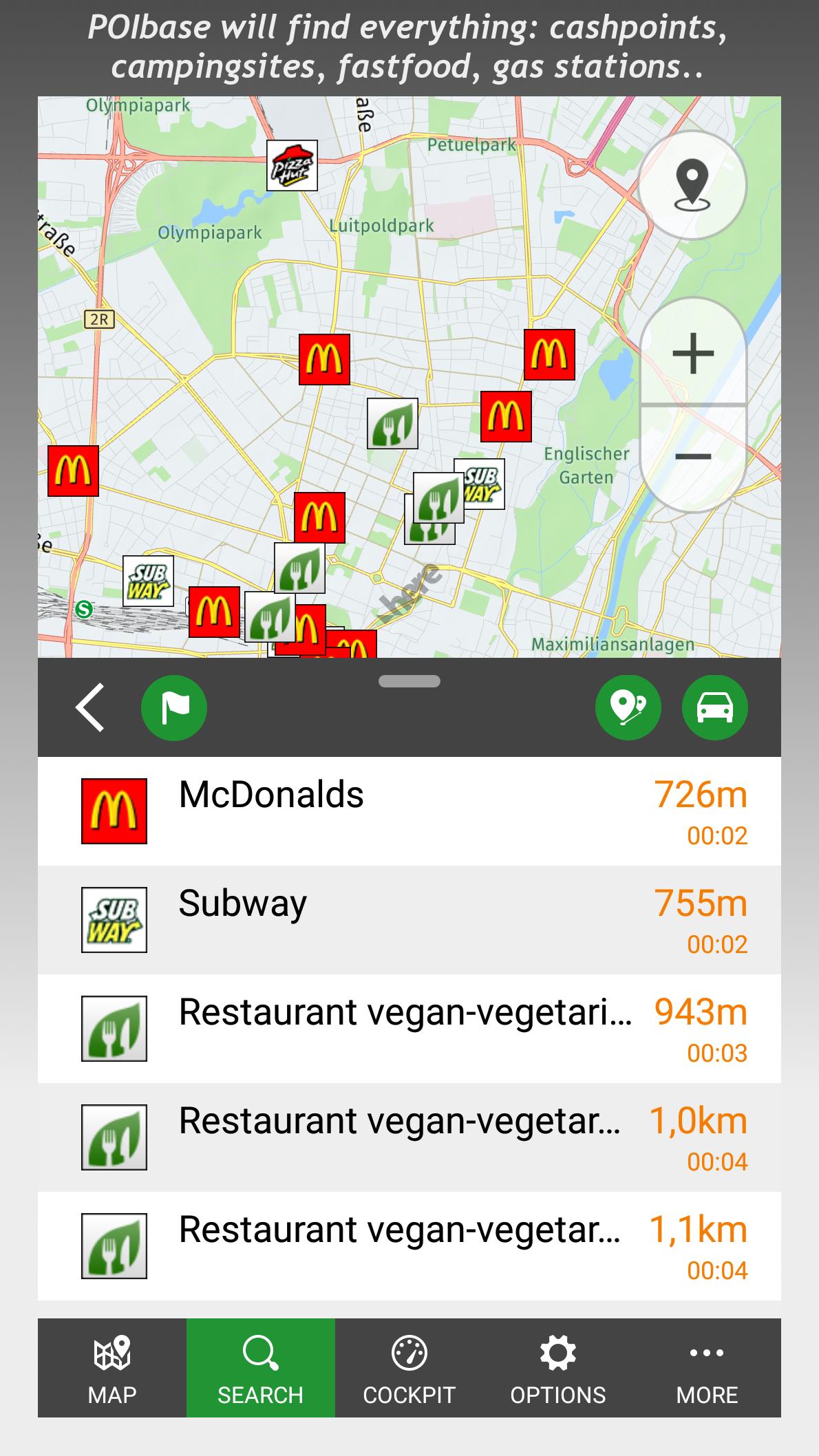 ★ Extensive POI categories and special functions include: Speed cameras, section control, traffic light cameras, geocaching, natural gas, CNG and LPG petrol stations, ATMs, fast food and other restaurants, camping and SUV parking places, parking lots & parking garages, pharmacies, doctors, hospitals, cinemas, mountain peaks, public swimming pools, mountain huts, hardware stores, discounters (e.g., Aldi, Real, Rewe etc.), specialist stores (e.g., Media Markt, Saturn, DM etc.), shopping centres (e.g., Karstadt, Marktkauf) , churches, couriers, hotels, vegan and vegetarian restaurants, and much more