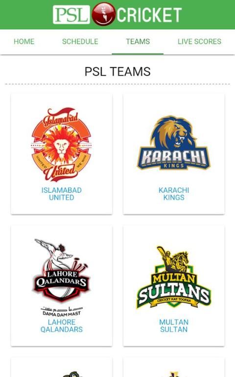 PSL 2018 aplikasi telah rinci profil dari semua Tim PSL: Lahore Qalandars, Karachi Kings, Peshawar Zalmi, Multan Sultan, Islamabad Inggris, Quetta Gladiator. Profil tim menunjukkan lokal dan pemain internasional informasi, jadwal tim dan tim hasil.