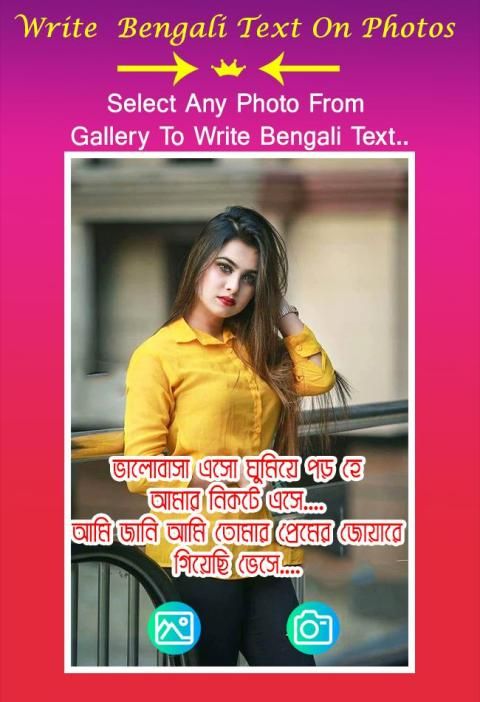 Welcome to my new write Bengali Text On Photos apps . Use the application to write Bengali poems, Shayari, Quotes, Funny Jokes and Baby Names on any photo. You can write your Bengali Name on your own photo too. Bengali Text On Photos create application that allows best photo text creator photo with many items photo or image. You can Write Bangla Shayari, Your Name on photo in Bangla, Bangla Poetry, Bangla Suvichar, Bangla Gazal, Bangla Jokes, Bangla Poem and Messages easily with the help of Bangla keyboard on your selected photo from gallery or camera.