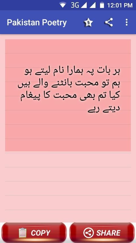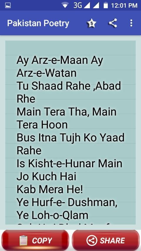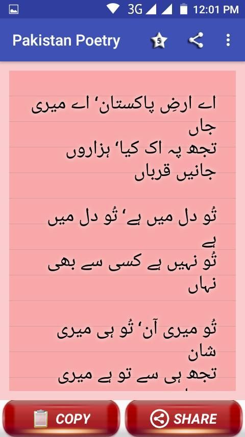This app contain superb collection of pakistan poetry , pakistan independance day wishes and status collection . 14 august sms and wishes. pakistan foaj poetry, patriotic poetry. pakistan zindabad shayari. Allama iqbal and mehdi hassan shairi.