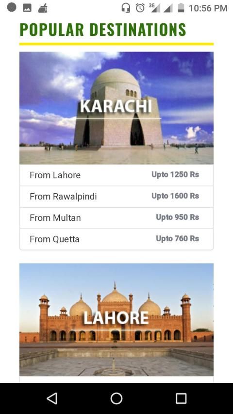 Informasi tentang tujuan populer seperti Lahore, Rawalpindi, Karachi dan Islamabad juga tersedia di aplikasi kereta api Pakistan. Anda dapat memeriksa tarif tiket kereta api dan jadwal Pakistan Railway langsung dari aplikasi ini.