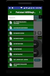Aplikasi ini berisi banyak Nasional Pakistan Milli Naghmay dalam format audio. millinaghmas baru secara teratur diperbarui. Pakistan tentara, PAF dan angkatan laut millinaghmas. Semua di satu platform seperti "main aisi qoum se hoon ... bara Dushman bana phirta hai". Banyak 14 Agustus "hari kemerdekaan" (Azaadi), PSL khusus, Qalander lahore Qalander dama dum tiang Qalander, karachi raja karachi jeetay ga, peshawar Zalmi akhpal tim pekhawar de, pakistan Tehreek e Insaaf Jiye imran khan hum sab ki shaan & 6 September "Pakistan Pertahanan Day" (Youm-e-Diffa) terkait mili-naghmay (lagu nasional) juga disertakan.