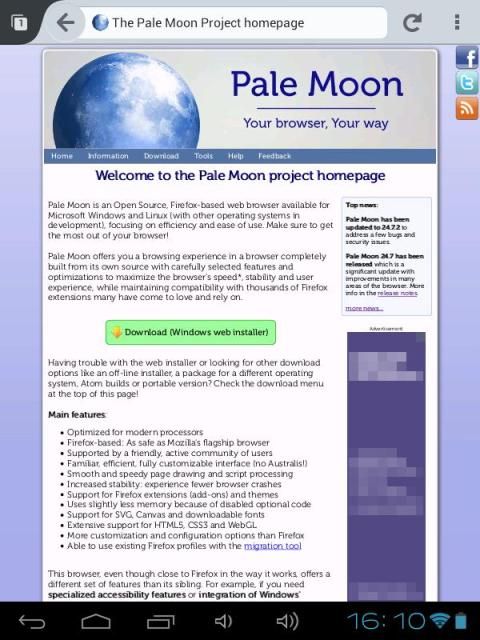Pale Moon telah melihat beberapa tahun pembangunan di desktop dan bertujuan untuk memberikan pengalaman serupa pada perangkat mobile dan tablet melalui Pale Moon untuk Android.