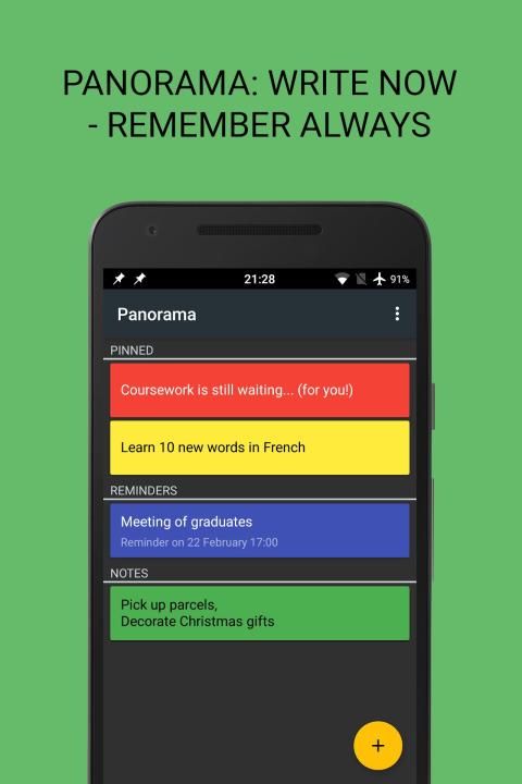 Anda belajar atau bekerja pada sebuah proyek, merencanakan sebuah acara atau pertemuan resmi dengan teman-teman - Panorama tidak akan membiarkan Anda untuk melupakan tentang hal itu. Hanya dalam beberapa klik Anda akan mampu membawa catatan penting, pengingat langsung ke status bar dan layar kunci. Segala sesuatu yang Anda perlu ingat akan selalu di depan mata Anda.