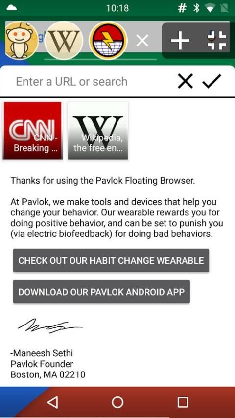 Browser Terapung Pavlok ini memungkinkan akses penuh ke web dengan floating yang unik tab desain browsing.