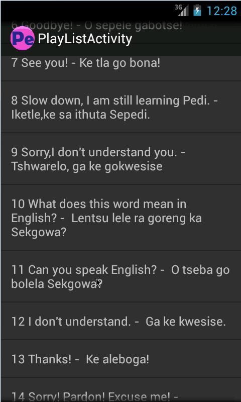 PediPhrases adalah aplikasi Android namun bermanfaat dan benar-benar bebas sederhana yang memainkan sekitar empat puluh sering digunakan Pedi (atau isiPedi) frasa percakapan dengan terjemahan bahasa Inggris mereka di ponsel Android Anda. Jika Anda menguasai ungkapan-ungkapan ini, Anda harus dapat menyenangkan dan "klik" dengan pembicara Pedi. Siklus app (random / berurutan) melalui berbagai frasa, dan Anda dapat memperpanjang jeda peralihan kalimat jika anda ingin berlatih dengan keras atau membutuhkan lebih banyak waktu. Anda dapat mematikan terjemahan bahasa Inggris sehingga Anda hanya dapat mendengarkan frase Pedi bermain kembali, jika Anda Komuter atau menunggu untuk melihat manajer bank! Juga pilihan untuk mengulang / bermain tunggal; panjang / jeda pendek dan acak / bermain berurutan.