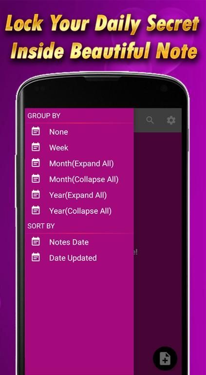 - Diary Pribadi dengan kunci aplikasi menyediakan untuk menyembunyikan rahasia catatan indah Anda dengan mudah.