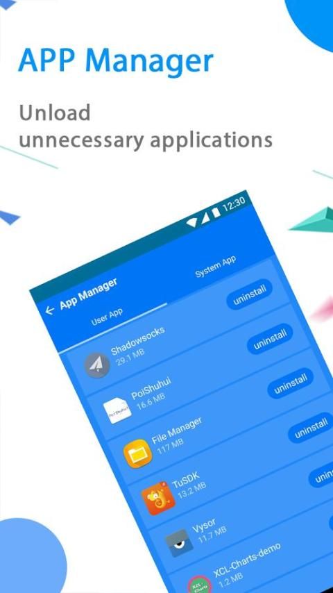 Cepat memindai untuk menemukan tempat sampah & Cache file dan membersihkan mereka semua untuk membebaskan memori Anda. Dengan fungsi ini, Anda tidak akan khawatir tentang masalah memori tidak cukup. Cepat melepaskan RAM dan memori telepon. Jadilah sampah terminator terbaik Anda.