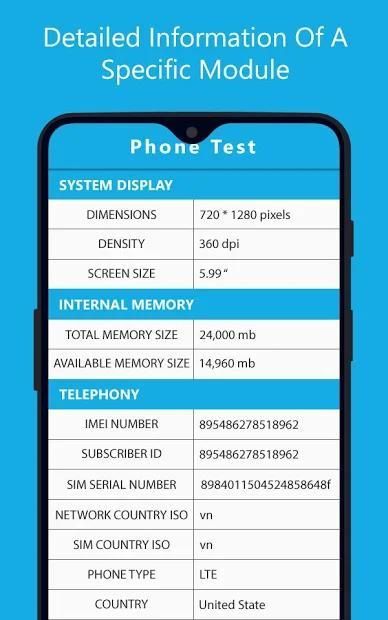 Menguji Semua Perangkat Keras dan Komponen Perangkat Lunak ponsel Anda. Pengujian dasar dimungkinkan dengan aplikasi ini. Aplikasi ini sangat berguna untuk menguji ponsel Anda sendiri (dalam hal ini tidak berfungsi dengan baik) atau ponsel lain sebelum membelinya.