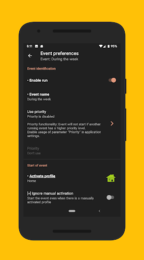 - priority, profile which will by activated on start/end, ignore manual profile activation, sound notification, undo profile activated before start of event, event start delay