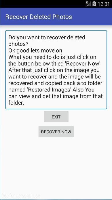 Aplikasi ini saat ini untuk memulihkan foto dihapus sepenuhnya fungsional, bebas, dan akan tetap gratis selamanya, dan penggunaannya sangat sederhana, hanya tekan mulai untuk memulihkan foto dihapus.