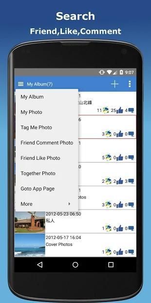 But Facebook does not provide a photo search function. For example: a friend has a like of the photo, most amount of comment photos ... and so on.