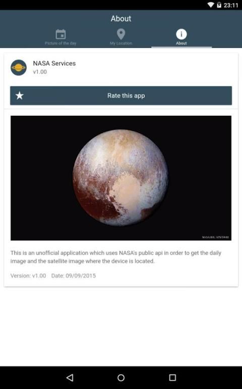 This is an unofficial application and all pictures are property of Nasa. This app uses Nasa's public api in order to get all data, so that services availability depends on them.