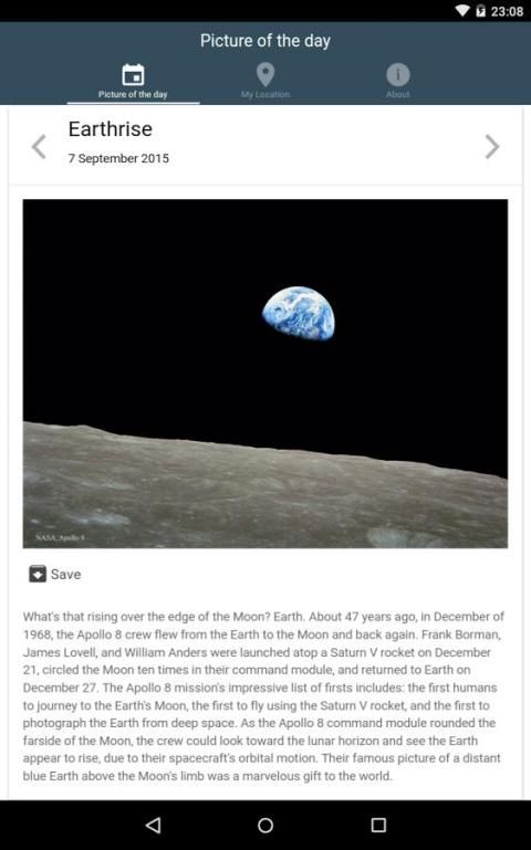 With this app you will enjoy watching the amazing Astronomy Picture of the Day and the satellite image by Landsat 8 for your device location.