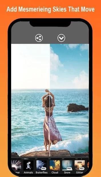 - Dull skies? Choose from a menu of sunsets and clear blue skies and then animate them with this AI-powered ‘auto’ tool.?