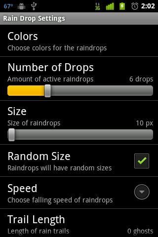 With touch features enabled you can shatter raindrops by touching them. Use the preview screen and the collision circle to setup your preferred touch radius.