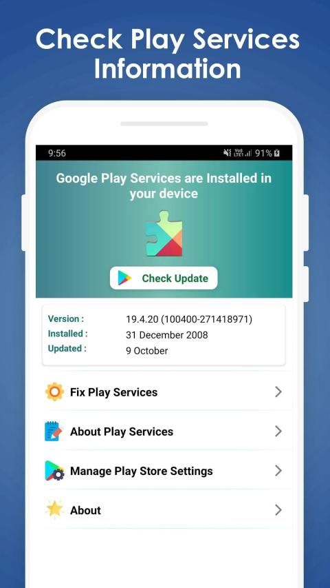 Play Services 2019 is a utility application that can be used to check the status of Google Play services, update and fix Play errors from one place. Furthermore, the tool has links to the Play Store, app info dialog and developer release notes.