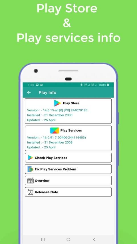 Ini adalah aplikasi utilitas kecil untuk memeriksa layanan bermain & memainkan versi Store, memperbarui, memasang status.