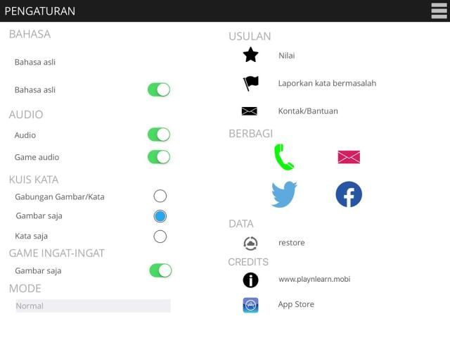 Bermain dan Belajar ENGLISH adalah pembelajaran App sempurna untuk anak-anak dan orang dewasa sama untuk belajar ENGLISH. Belajar kosa kata, ejaan dan alfabet. Menguji kemampuan Anda dengan kuis dan memori teka-teki dan mengambil kata-kata baru dengan Play dan Pelajari ENGLISH.
