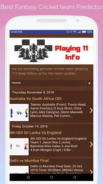 All Fantasy cricket playing 11 squad information available here you can refer in this app(Playing 11 Info) you get better experience for highest earning and use your different teams and win big cash rewards from fantasy sites like dream11, playerzpot and halplay etc...