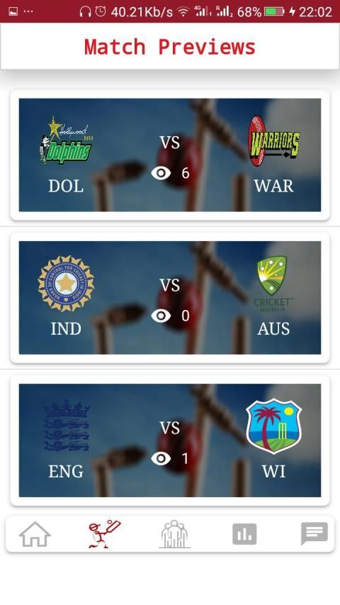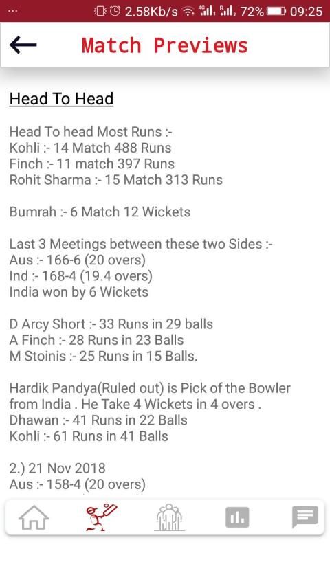 * Match Previews: This screen provides 'Possible11' for both playing teams, squad details and Full Depth Analysis of Pitch Report.