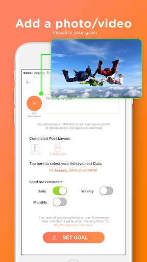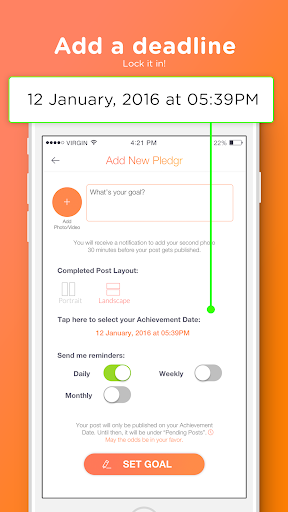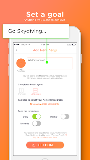 Tidak seperti aplikasi lain Itu memungkinkan Anda untuk menghapus dan mengedit semuanya, pledgr terkunci di tujuan Anda secara permanen dan mengingatkan Anda untuk mencapainya. Anda tidak dapat mengambilnya kembali begitu gol diatur, memaksa Anda untuk menjadi orang dari kata-kata Anda dan finisher, bukan quitter. Pada "Tanggal Prestasi", PledGr akan mengirimkan pemberitahuan untuk memeriksa apakah Anda mencapai atau gagal. Tujuan Anda kemudian diterbitkan dengan pita "tercapai" atau "gagal"! Situs Merayakan keberhasilan dan upaya dengan teman dan jaringan Anda!
