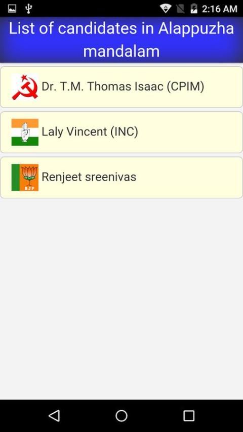 App memberikan informasi tentang calon, menteri dan pemimpin utama kerala. Hal ini juga memberikan hasil pemilihan pemilu sebelumnya.