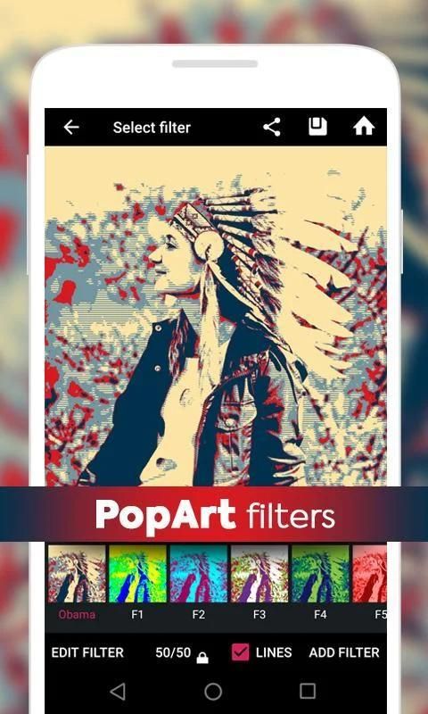 Menggunakan opsi Tambahkan filter Anda dapat menambahkan tekstur dan filter ke pop art Anda.