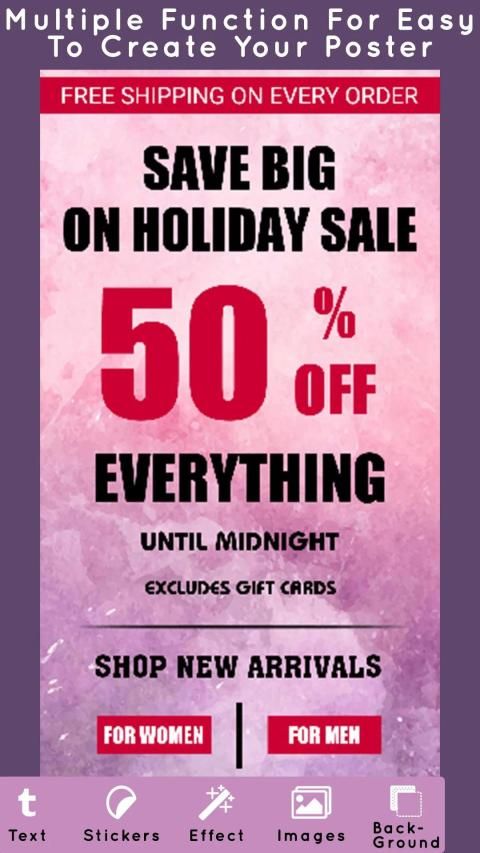 Create promotional posters, advertisement, offer announcements, cover photos on the go with amazing backgrounds, texture, effects, fonts, sticker and get the attention you want.