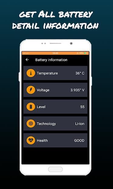 ✓ Inside the Battery details section of our optimize battery app you will be able to find many details and information about you battery life, You will be able to see the percentage of battery energy as well as Temperature in C°, percentage, voltage and level.