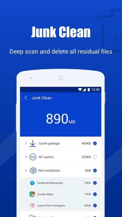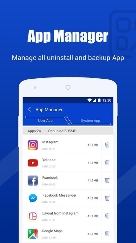 Membantu Anda mengetahui aplikasi perlu, membuat backup dan meng-uninstall aplikasi yang tidak perlu untuk menghemat lebih banyak ruang. Membebaskan ruang penyimpanan yang lebih, mempercepat ponsel Anda begitu mudah.