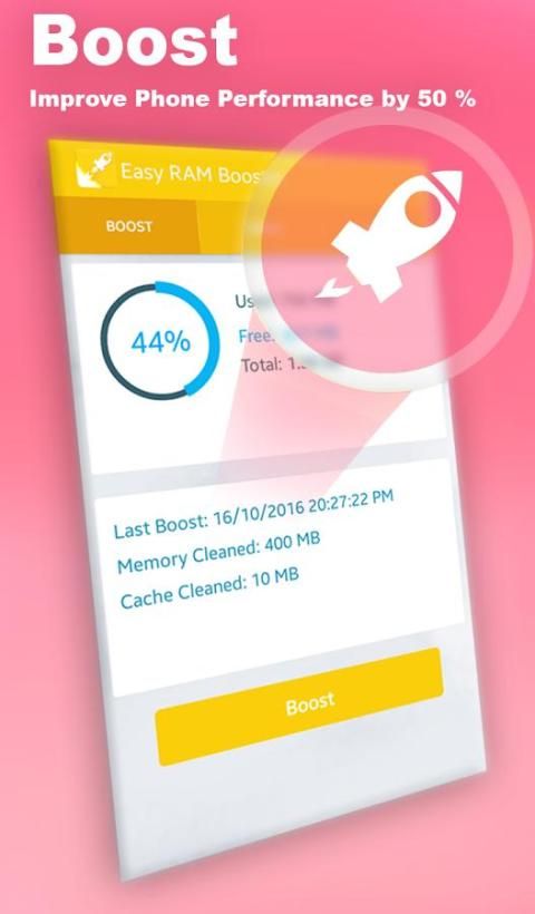 Meningkatkan Bersih menemukan aplikasi menggunakan memori tinggi dan memaksa menghentikan mereka untuk meningkatkan kinerja lebih dari 50% seperti telepon berakar. Bila Anda menemukan telepon Anda laggy, hanya menggunakan Fitur Meningkatkan Powerfull untuk mempercepat itu, aplikasi akan hibernasi setelah aplikasi memori / RAM yang jelas dan dorongan, dan keras kepala sulit untuk me-restart slinkingly lagi. Maka ponsel lebih cepat, dan baterai tahan lama.