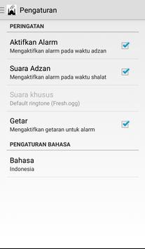 Pada menu setting anda dapat mengaktifkan alarm, membunyikan suara adzan, mengganti suara adzan dengan nada lain, mengaktifkan getar, dan juga dapat mengganti Bahasa (Indonesia atau Inggris) untuk aplikasi ini